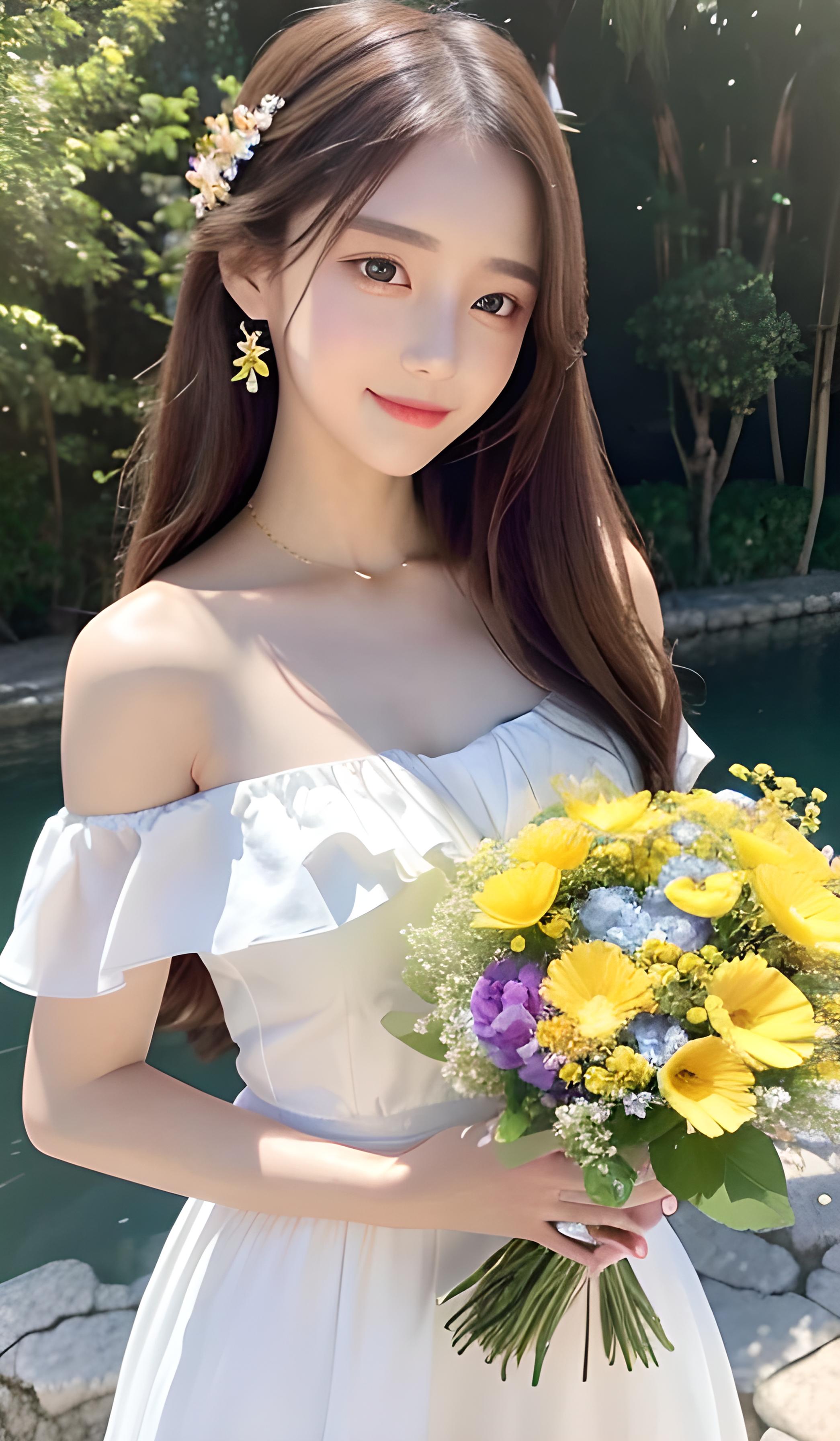 逼真人物,甜美女孩,长头发,宝石发饰,精致眼妆,五官立体,有锁骨,穿彩色露肩连衣裙,在阳光下,在花海中,有群蝶飞舞,抱着一束花束,开心,微笑
