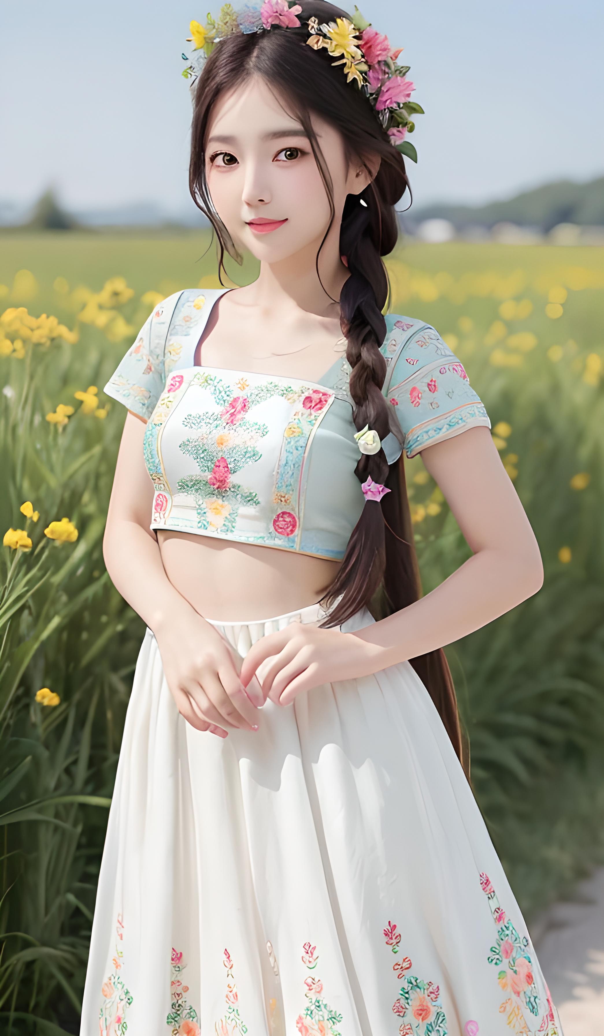 一个稚嫩可爱的少女,复古刺绣小花上衣,开衩半身裙,五颜六色,背景是草原,高细节,8k分辨率,超高分辨率,彩虹色亮光长发麻花辫子,彩色清澈眼眸,头戴五颜六色的花,(顺滑的头发,精致完美的五官,最美的大眼睛,长长的睫毛,眼睛甜美有卧蚕,微笑,面向镜头,动态角度,极致画质,最高精度,精确完美的人体结构,4分之3镜头