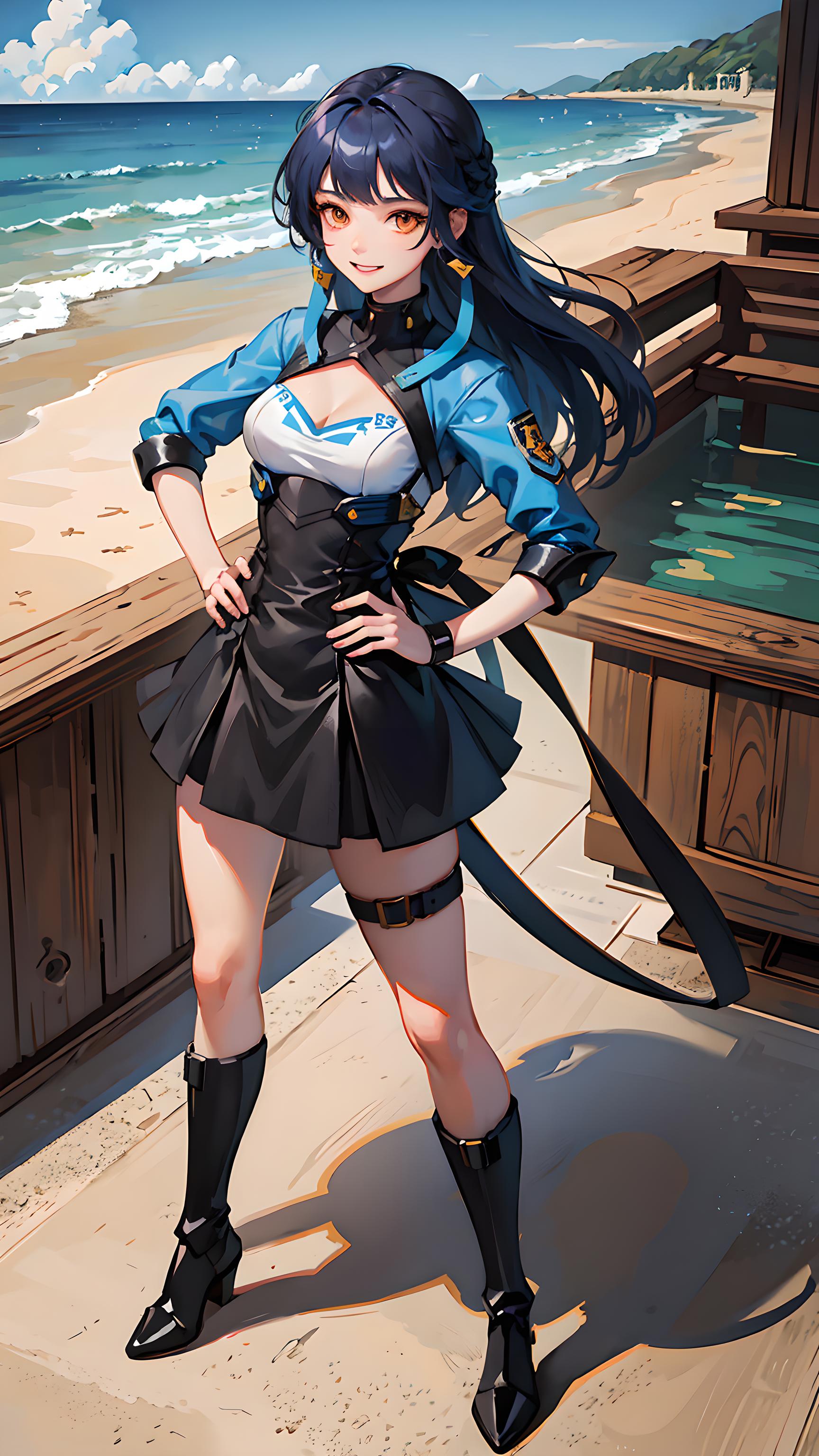best quality, masterpiece, 1girl, full body, mecha clothes, azure hair, medium breasts, looking at viewers, game cg, sea, day, knight, orange eyes, boots, shackles, grin, hand on hip