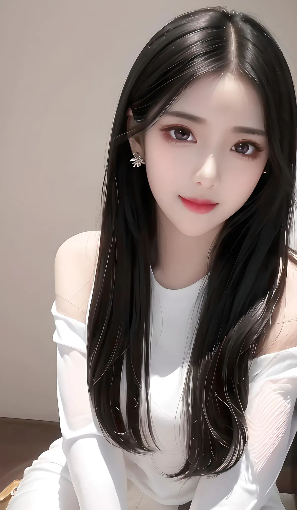 一个稚嫩可爱的少女,((紧身保守一字肩不规则衣服,白色牛仔裤))夏天,室内,高细节,8k分辨率,超高分辨率,亮光长发,顺顺的黑直发,亮晶晶的耳环,彩色清澈眼眸,(顺滑的头发,精致完美的五官最美的大眼睛,长长的睫毛,眼睛甜美有卧蚕,微笑,动态角度,极致画质,最高精度,精确完美的人体结构,面向镜头,甜美的笑容,透光的嘴唇,微红的脸庞,油光的嘴唇