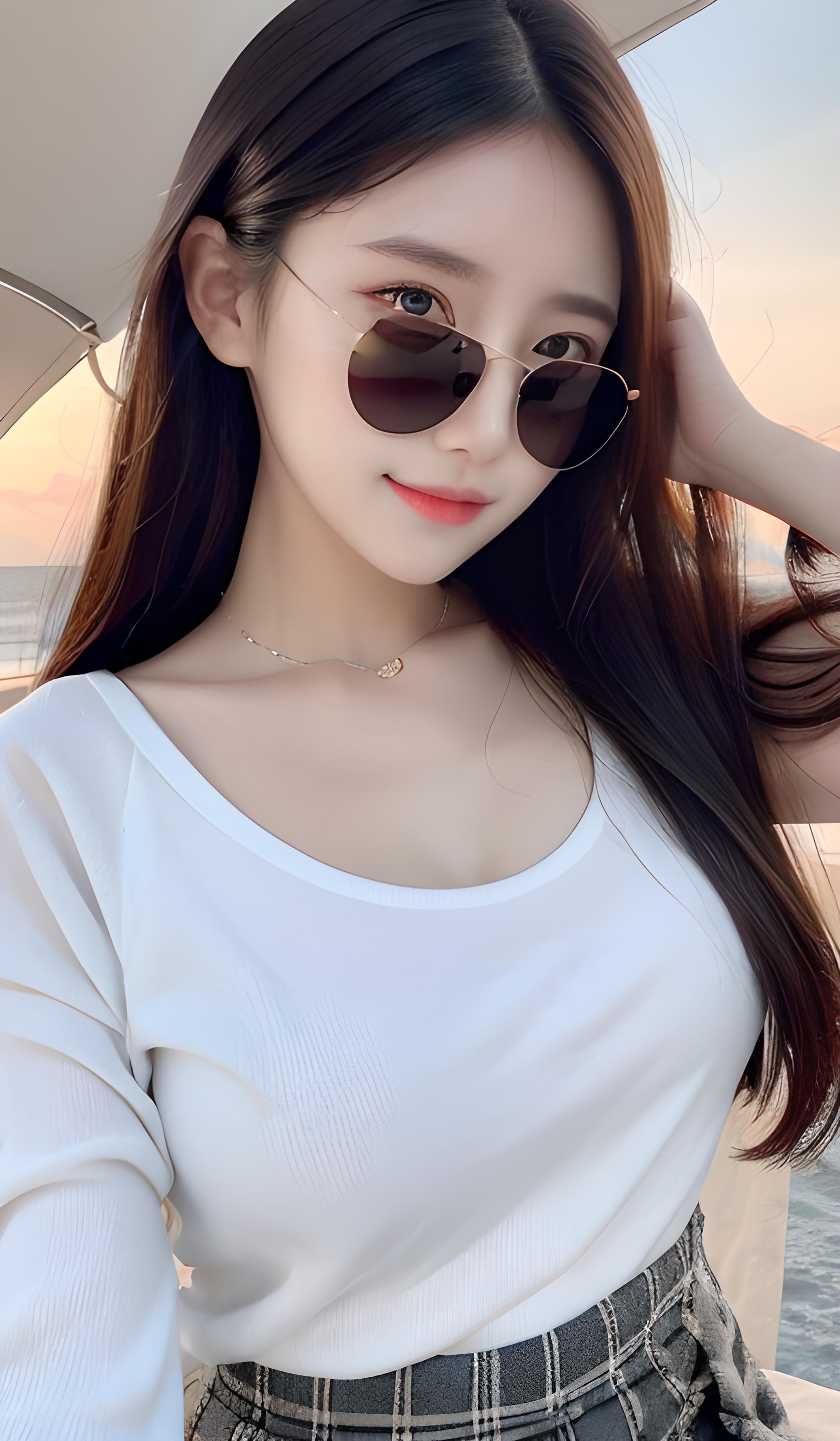 高细节,8k分辨率,一个稚嫩少女可爱的少女,清澈眼眸,锁骨,精致完美的五官,最美的大眼睛,长长的睫毛,眼睛甜美有卧蚕,微笑,(带黑色墨镜)动态角度,极致画质,精确完美的人体结构,(白色半透明紧身衬衣麻花辫,格子半身裙)(面部补光)在户外,在大海边看夕阳
