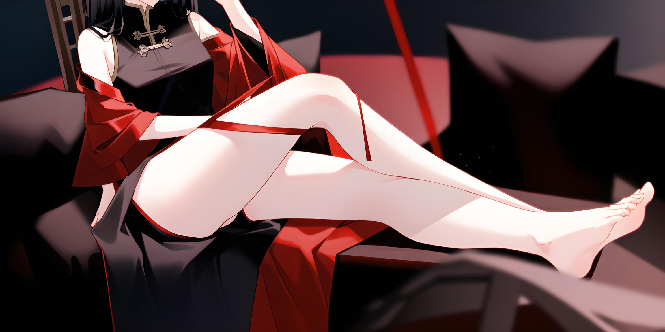1girl,bare_legs,barefoot,black_hair,blurry,blurry_background,blurry_foreground,china_dress,chinese_clothes,depth_of_field,dress,feet,grey_background,head_out_of_frame,legs,long_hair,long_sleeves,motion_blur,photo_(medium),red_dress,red_kimono,sitting,solo,toes