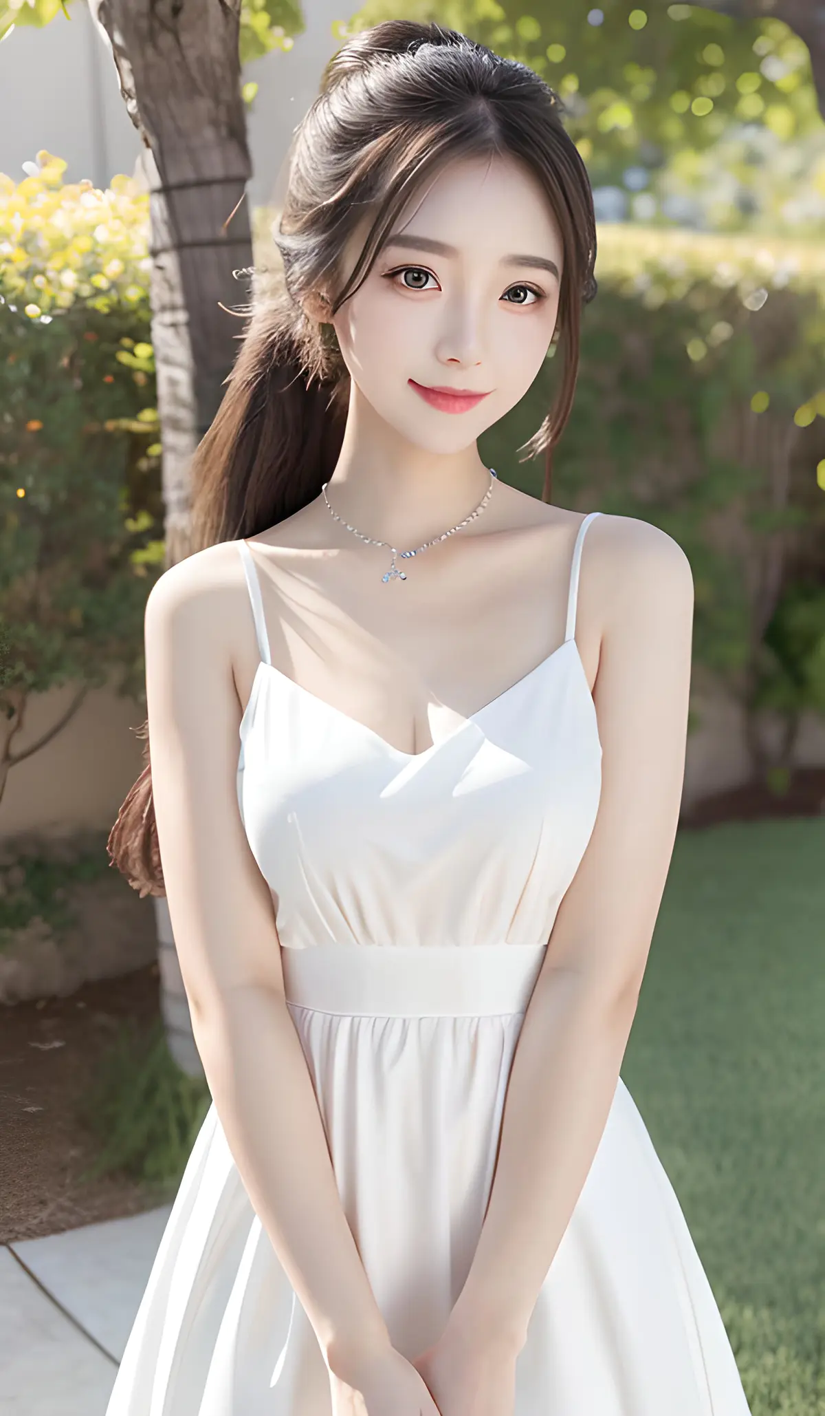 咒语(Prompt): 现实主义,漂亮可爱的少女, 杰作, 最好的质量,项链, 一个精致美丽的女孩,宝石般大眼睛,长睫毛,美瞳,眼睛甜美有卧蚕,甜美的笑容,(面部补光),高马尾辫,蓬松的头发,带留海,顺滑肌肤,彩色连衣裙,漏双肩,标志的身材,身材匀称,7分照,精致的手臂,站在室外