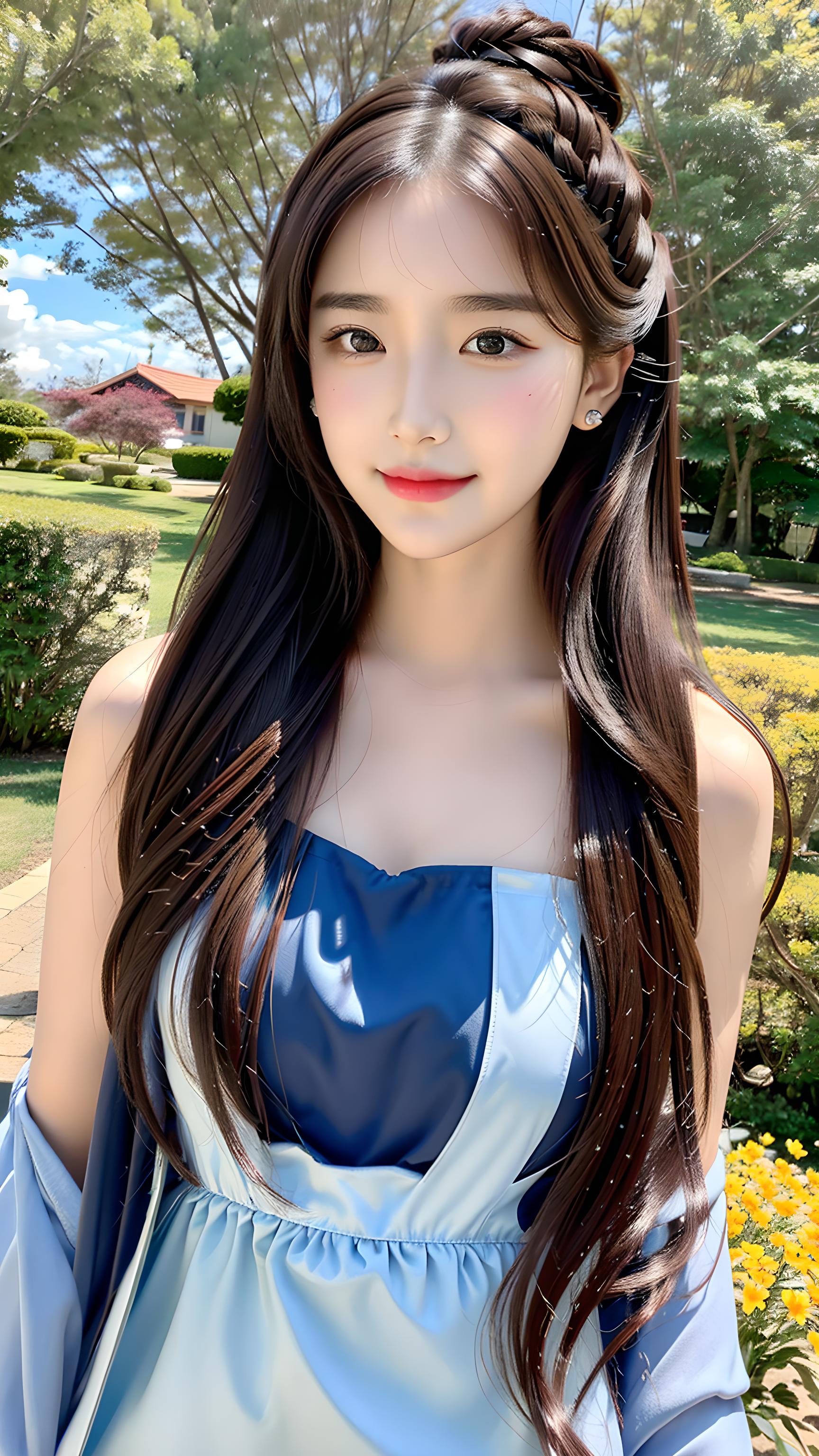 高细节,超高分辨率,更高质量,最好画质,逼真,7分镜头,精致的五官,完美的五官,逼真的人体构架,发光皮肤,完美的脸,(完美的身材,身高175cm),女孩,单人,学生,细长V字眉,长睫毛,水汪汪大眼,露齿笑,水水的嘴唇,2.5D脸红,棕发,留海,眉间留海,斜留海,编织发髻,长发髻,心形呆发,单丸子头,闪亮的头发,耳钉,耳坠,(平胸方格背心,无肩带,超精细细节),动态角度,正面视角,翼展双臂,花园背景,超精细细节,自然光,极致画质背景,最高精度背景
