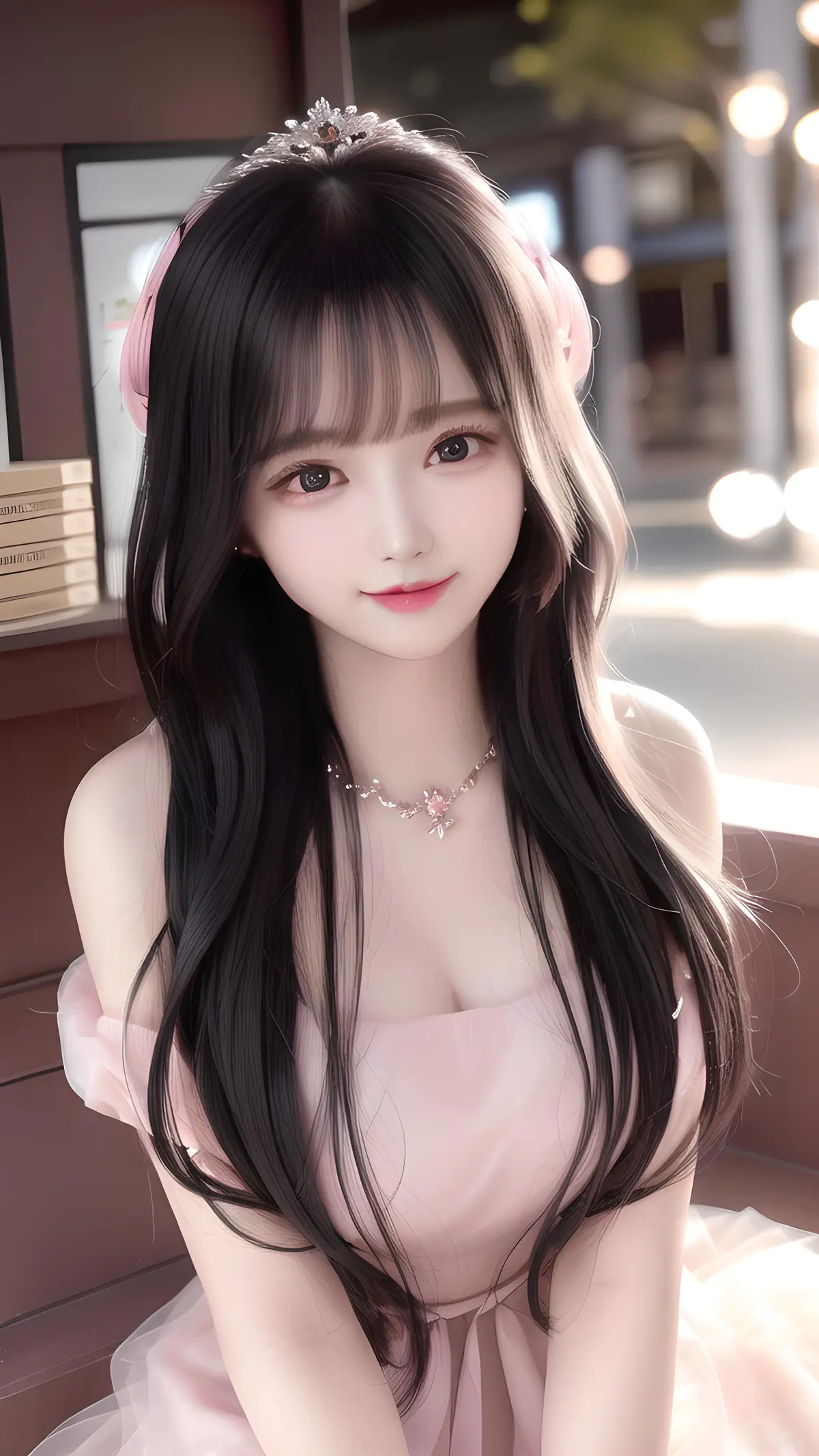 更多细节,8k分辨率,超高分辨率,最好画质,美少女,口红,爱心瞳,绝世美女,凌乱黑色直发,齐肩短发,蓬松的头发,浓艳美丽的妆容,精致完美的五官,最美的大眼睛,脸红,项链,甜美笑容,大街,粉红色连衣裙,动态角度,极致画质,项链
