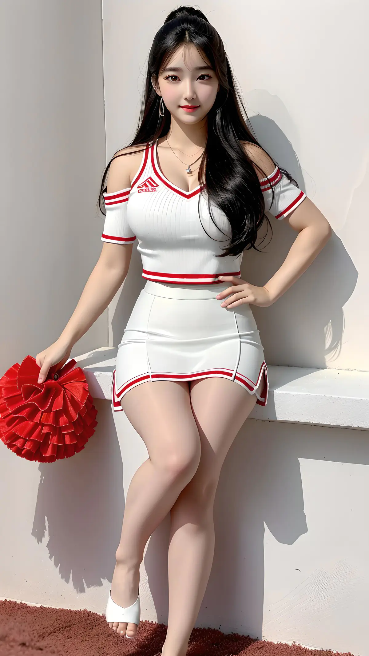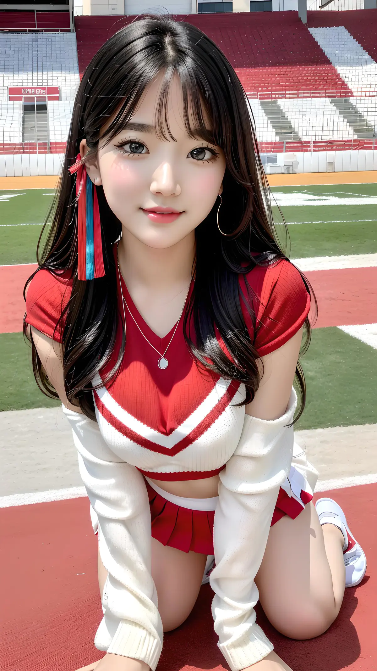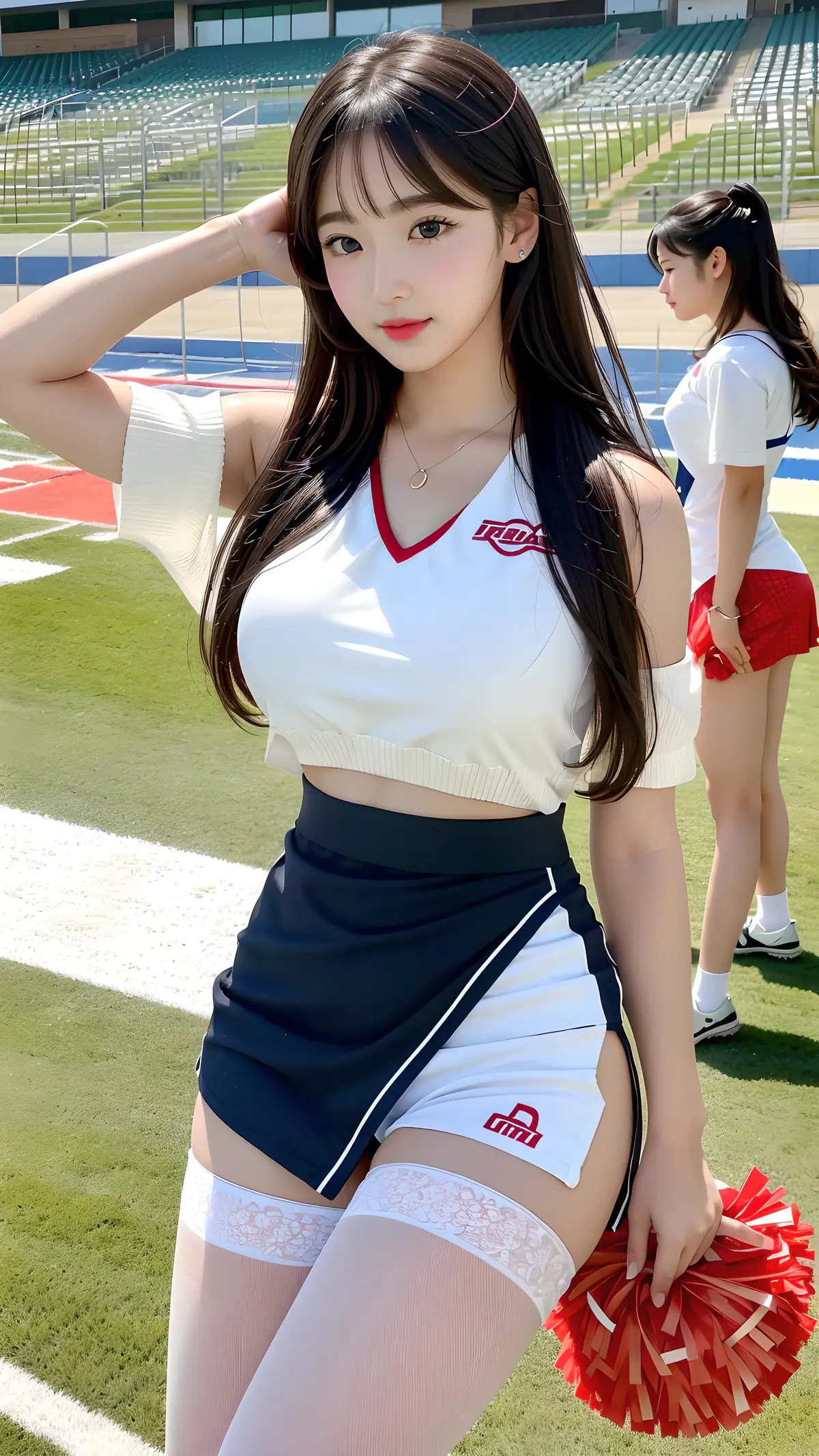 超高清,超细节,8k分辨率,超高分别率,最好画质,高细节,一个稚嫩可爱的女孩,彩色清澈眼眸,精致完美的五官最美的大眼睛,长长的睫毛,眼睛甜美有卧蚕,微笑,(黑色头发,长发过肩),头发柔顺,网红脸,项链,网红脸,详细刻画的脸,详细刻画的表情,详细刻画的五官,大师杰作,细节拉满,详细刻画的背景,详细刻画的人物,详细刻画的头发,详细刻画的发丝,详细刻画的身体,详细刻画的手指,详细刻画的衣服,详细刻画的脸,完美的脸,详细刻画的手臂,详细刻画的腿,详细刻画的足,详细刻画的脚趾,详细刻画的发丝,发光皮肤,水润的红唇,面向观者,夏天,在足球场上,站着,(穿着啦啦队的队服,针织白色短裤,透明裤袜,裸足),提裙,纯欲,完美比例胸部,身材苗条,动态角度,最高精度,精确完美的人体结构