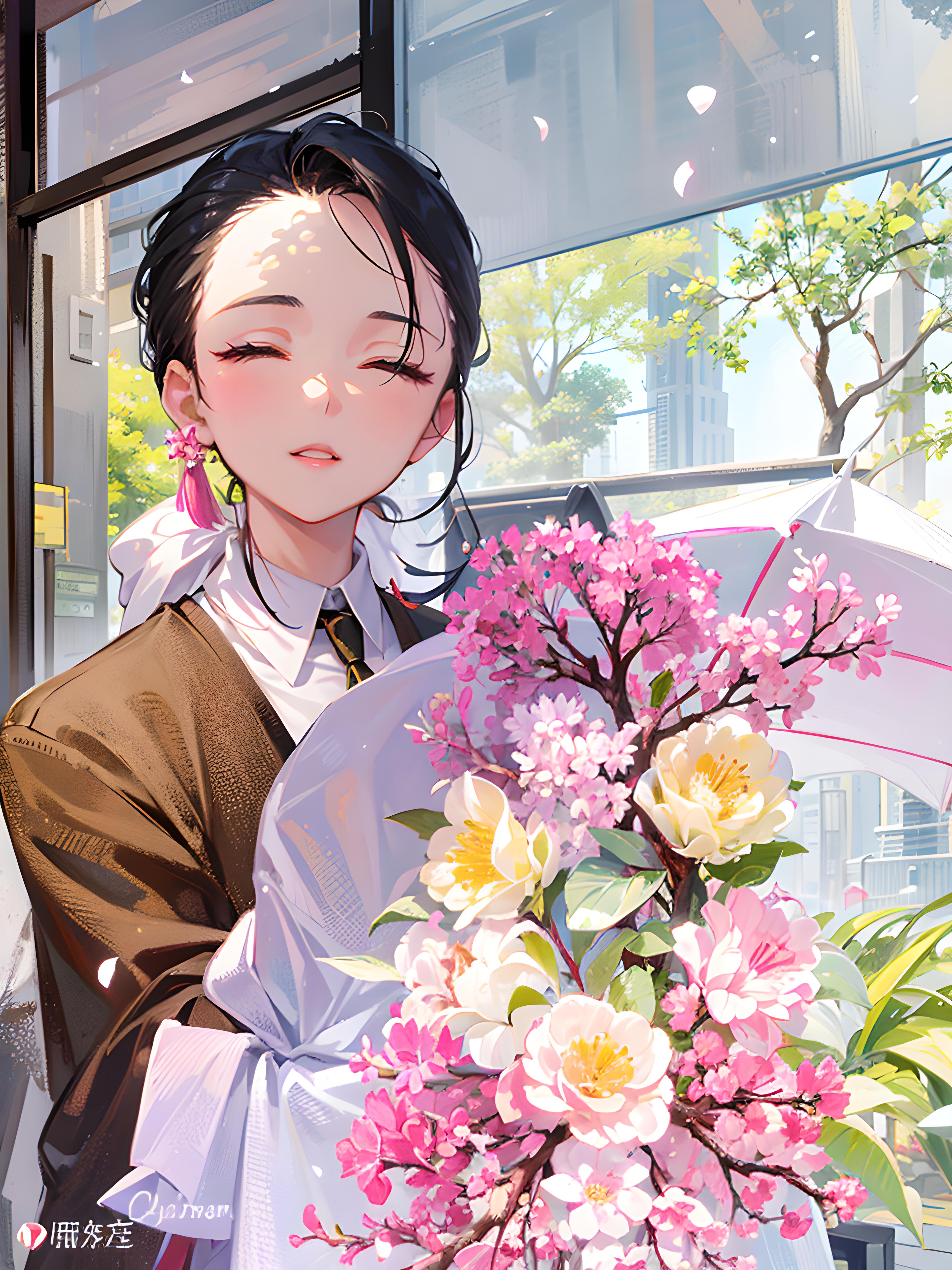 1girl,architecture,artist_name,asian,black_eyes,black_hair,branch,building,chain-link_fence,cherry_blossoms,city,day,east_asian_architecture,fence,flower,forehead,half-closed_eyes,holding_umbrella,house,hydrangea,lips,necktie,oil-paper_umbrella,outdoors,parasol,petals,pink_flower,pink_rose,realistic,smile,solo,spring_(season),street,tree,umbrella,white_flower,window,wing_collar