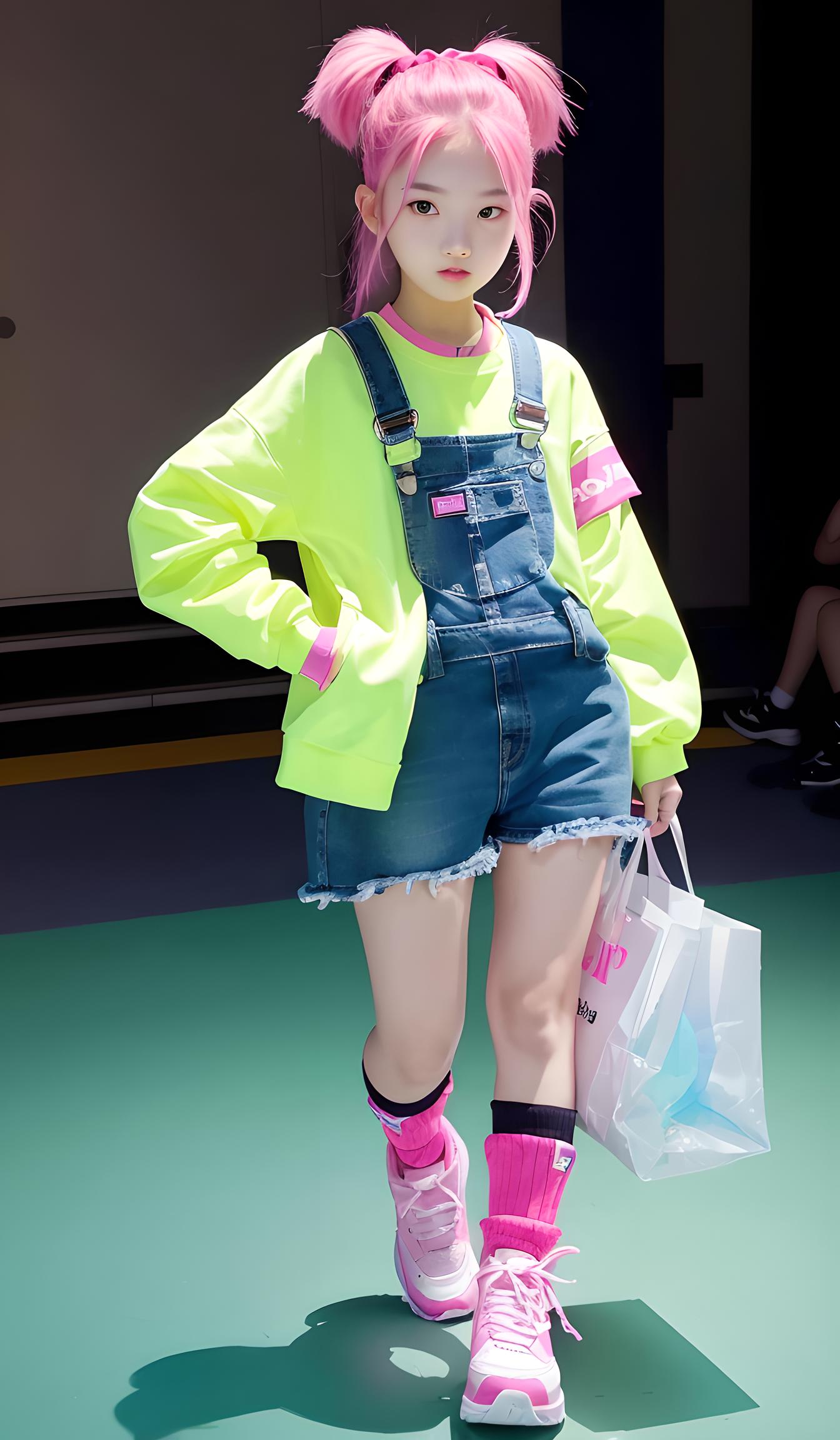 一个青春活力的女孩,双丸子头,粉红色的头发,身上穿着绿色镂空时尚感的衣服,下身穿着蓝色的喇叭裤,脚上穿着马丁靴,手里挎着一个包包!
