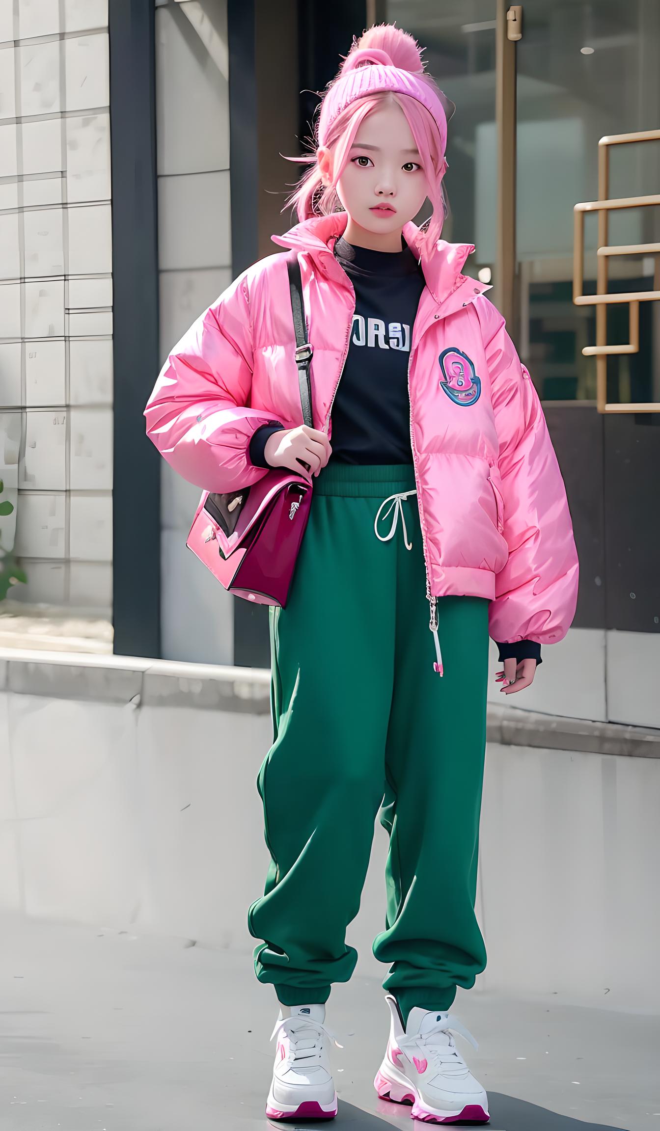 一个青春活力的女孩,双丸子头,粉红色的头发,身上穿着绿色镂空时尚感的衣服,下身穿着蓝色的喇叭裤,脚上穿着马丁靴,手里挎着一个包包!