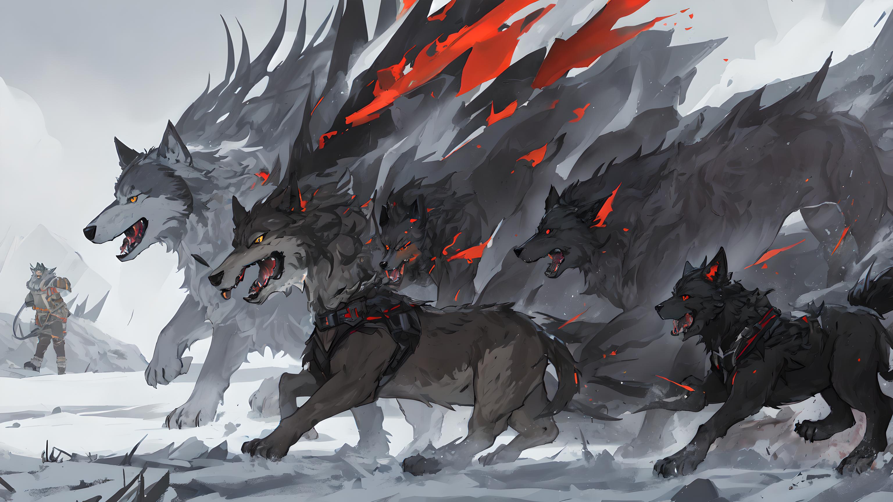 战斗狼,未来科幻,体型较大,约1.5米高,2米长,肌肉发达,毛色深黑,眼睛炯炯有神,獠牙锋利,爪子强劲有力,尾巴粗大有力。在一片荒野上,战斗狼迅速奔跑着,身后紧跟着一群狼群成员。突然,一群猎狗从远处冲了过来,战斗狼立刻停下了脚步,准备迎战。猎狗一拥而上,战斗狼闪避着它们的攻击,然后猛地向其中一只猎狗扑去,将其狠狠地撞倒在地。其他猎狗也纷纷向战斗狼扑来,