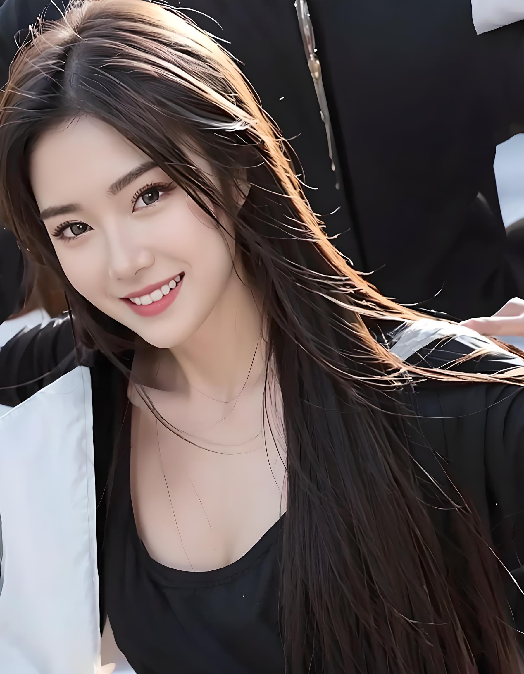 纯欲写实 真人真画 逼真黑色衣服 长发飘飘 微笑