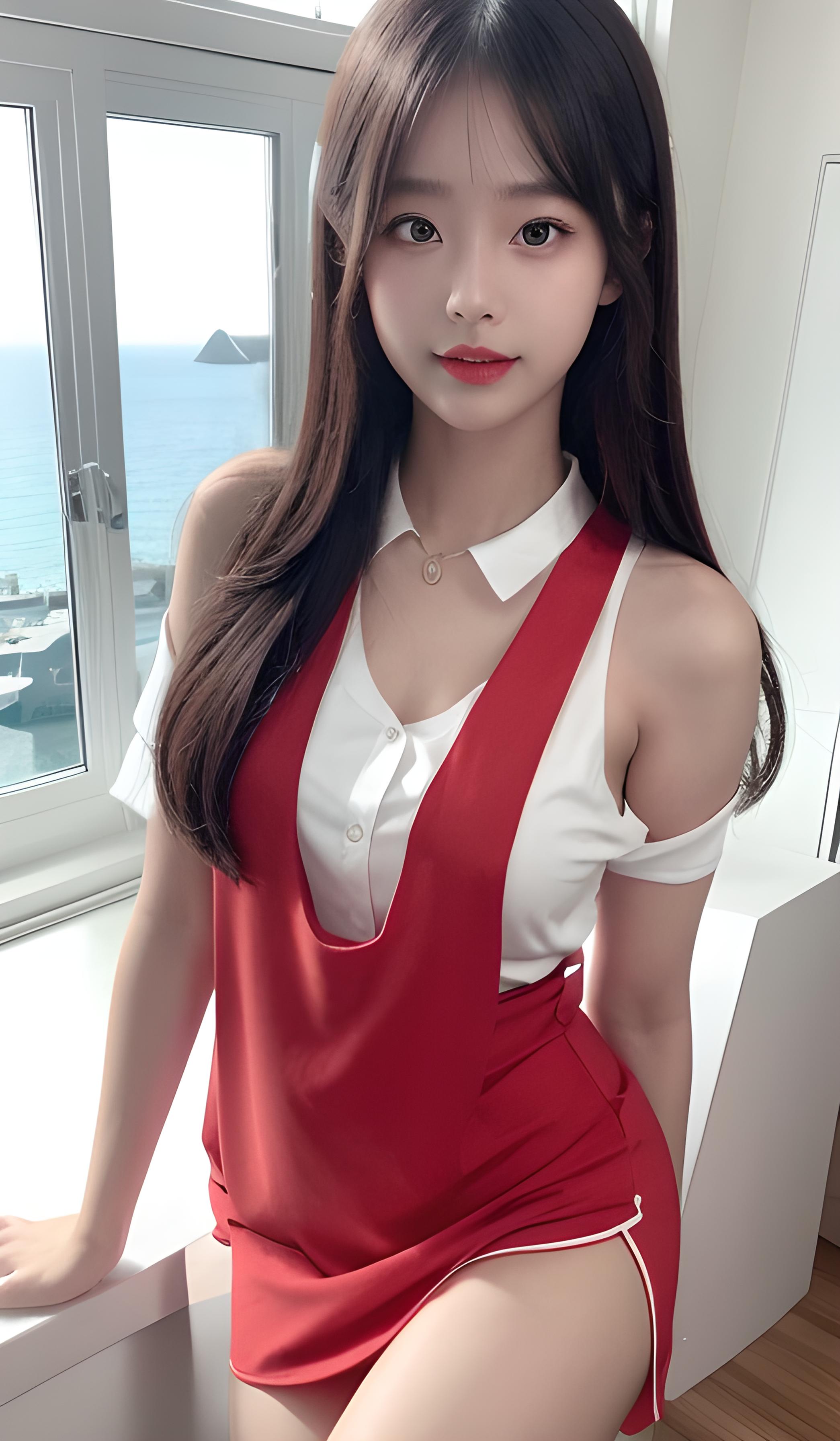 高细节,8k分辨率,超高分辨率,最好画质,美少女,口红,爱心瞳,绝世美女,凌乱亚麻色直发,齐肩短发,顺滑的头发,浓艳美丽的妆容,精致完美的五官,背景海景房身体靠窗户,最美的大眼睛,脸红,甜美笑容,穿着红色吊带,下身超短裙,靠近观者,动态角度,全身照,极致画质,最高精度,