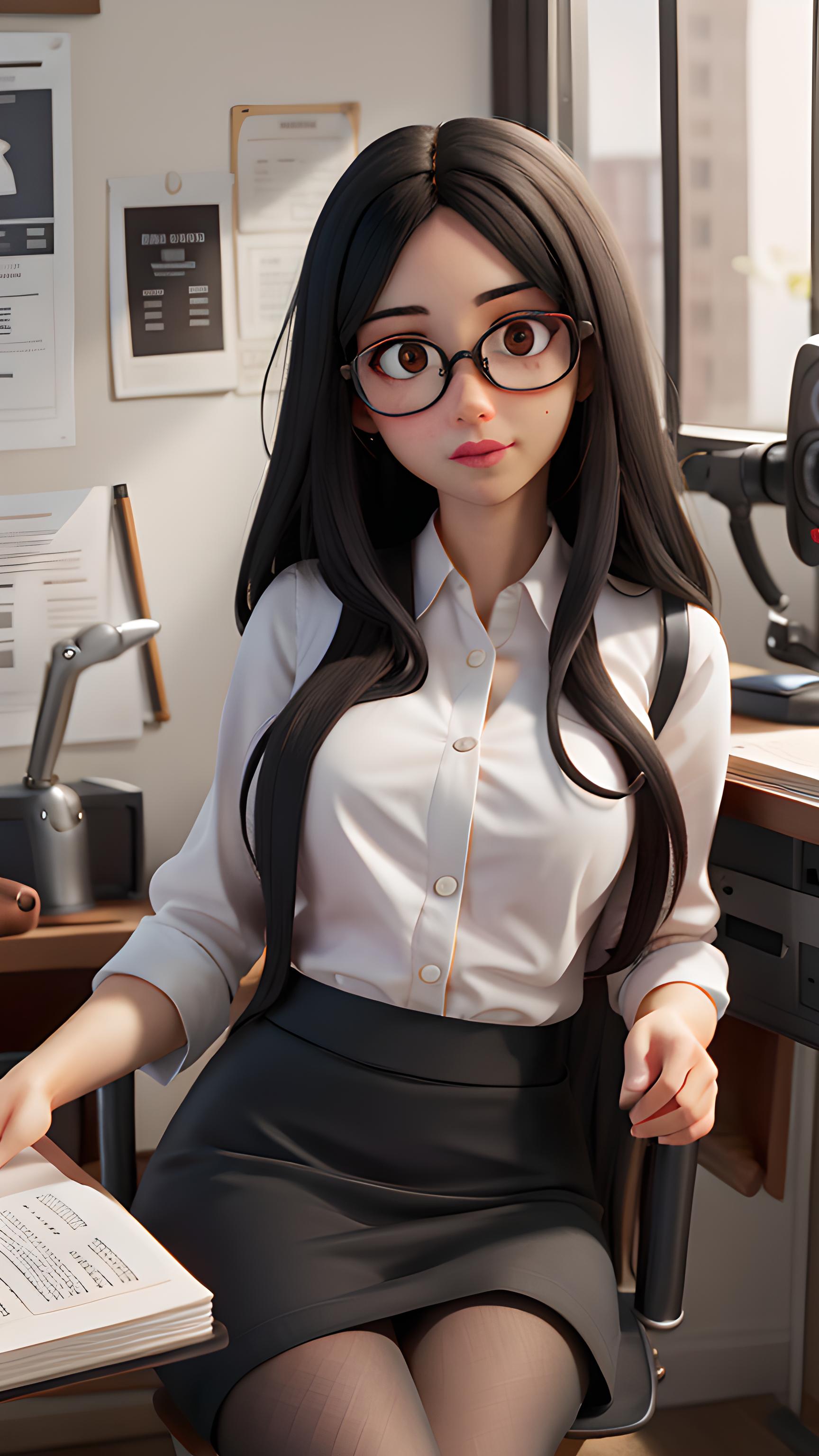 1girl,black_hair,book,book_stack,breasts,computer,desk,glasses,indoors,laptop,large_breasts,lips,long_hair,mole,mole_under_eye,office,office_lady,on_desk,open_book,pantyhose,paper,pencil_skirt,shirt,sitting,sitting_on_desk,skirt,solo,teacher,underwear