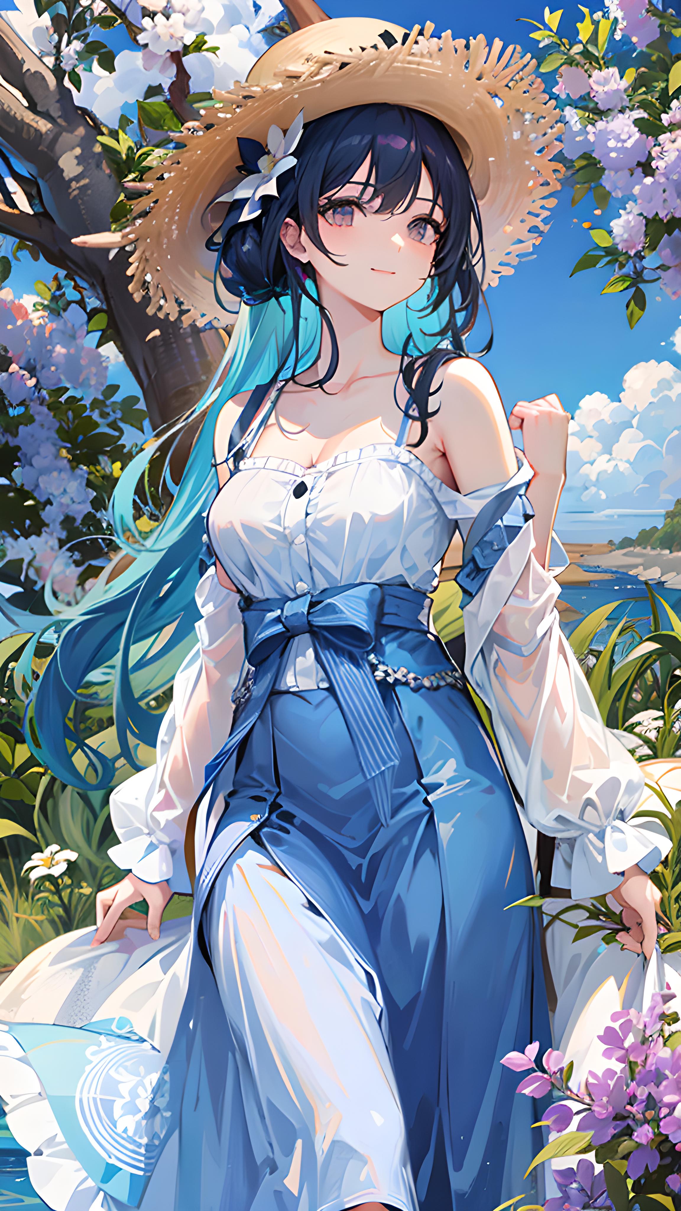 1girl,arm_at_side,arm_support,bare_shoulders,black_hair,blue_sky,breasts,brown_eyes,cloud,cloudy_sky,day,dress,flower,grass,hat,hat_flower,long_hair,looking_at_viewer,ocean,off_shoulder,outdoors,purple_flower,sitting,sky,smile,solo,straw_hat,sun_hat,tree,water,waves