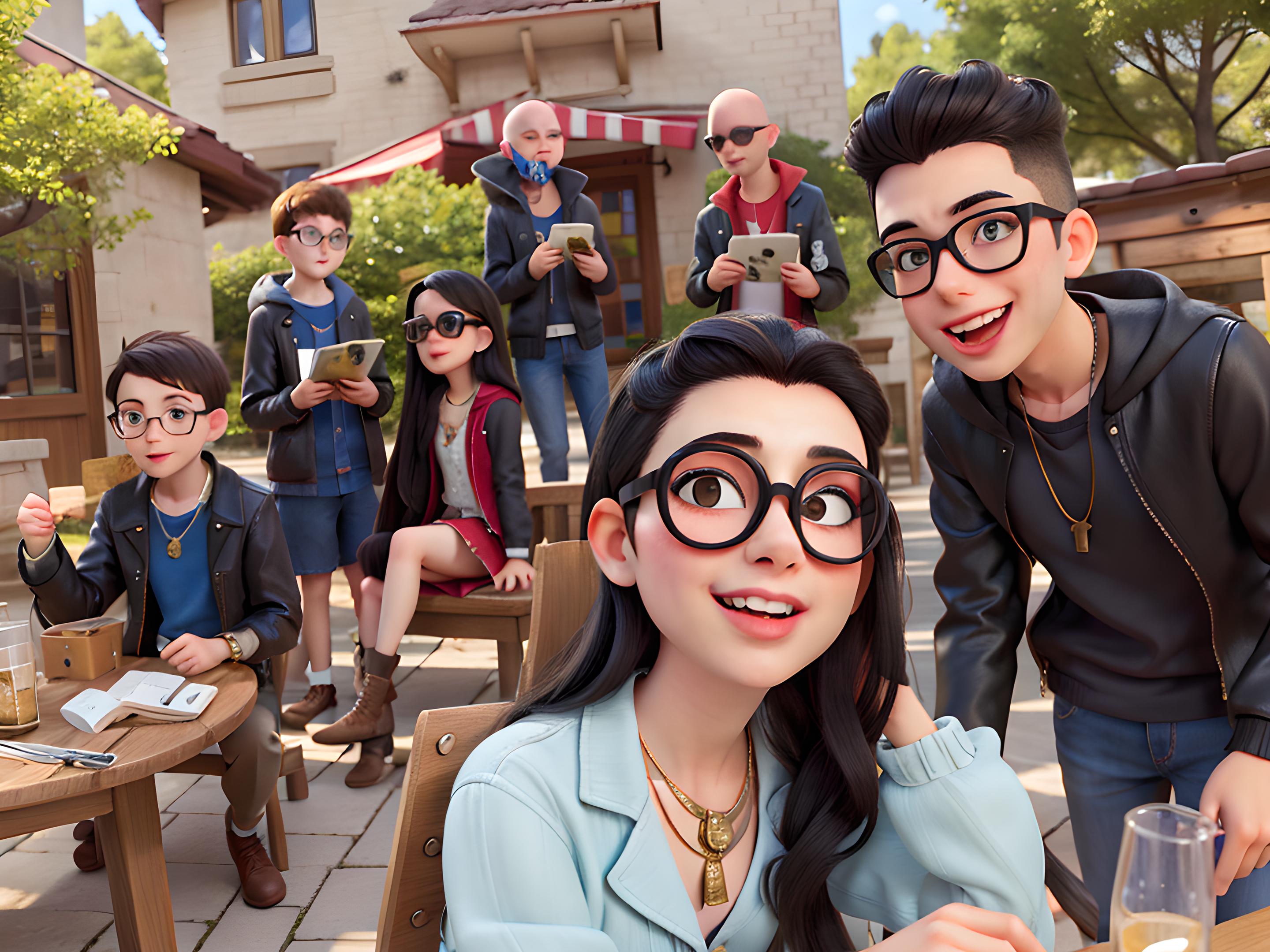 6+boys,bald,black_hair,dress,eyewear_on_head,glasses,jacket,jewelry,lips,long_hair,mask,multiple_boys,multiple_girls,necklace,outdoors,realistic,sitting,smile,sunglasses