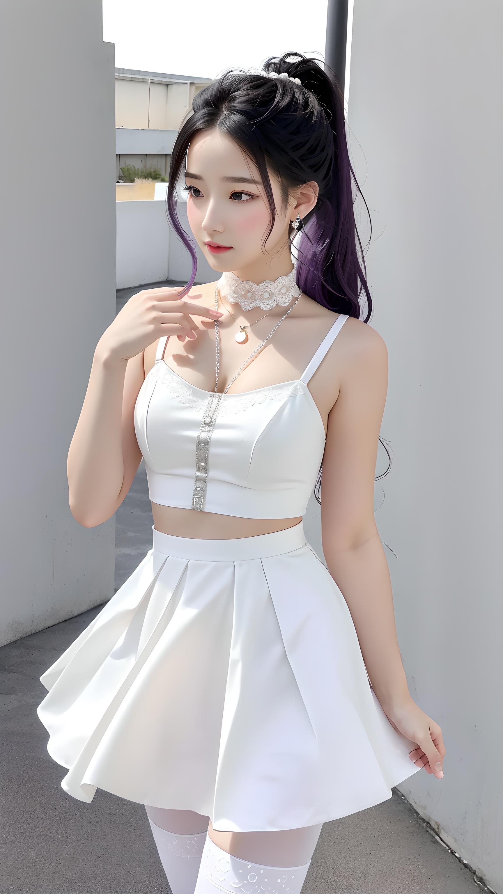 头黑色秀发简单扎成马尾,精致剪裁的黑白色的休闲装,圆领露出清晰漂亮的锁骨.灰色超短裙搭上打底裤,恰到好处衬出修长双腿,白色凉靴简单大方,雪白皓腕上斜扣了对月牙链。头及腰的紫色发丝,清澈如水的紧瞳双眼,身穿白色吊带裙,吊带裙上有一粒一粒的红色小点下摆还有一圈蕾丝,身上穿了一件白色外衣,