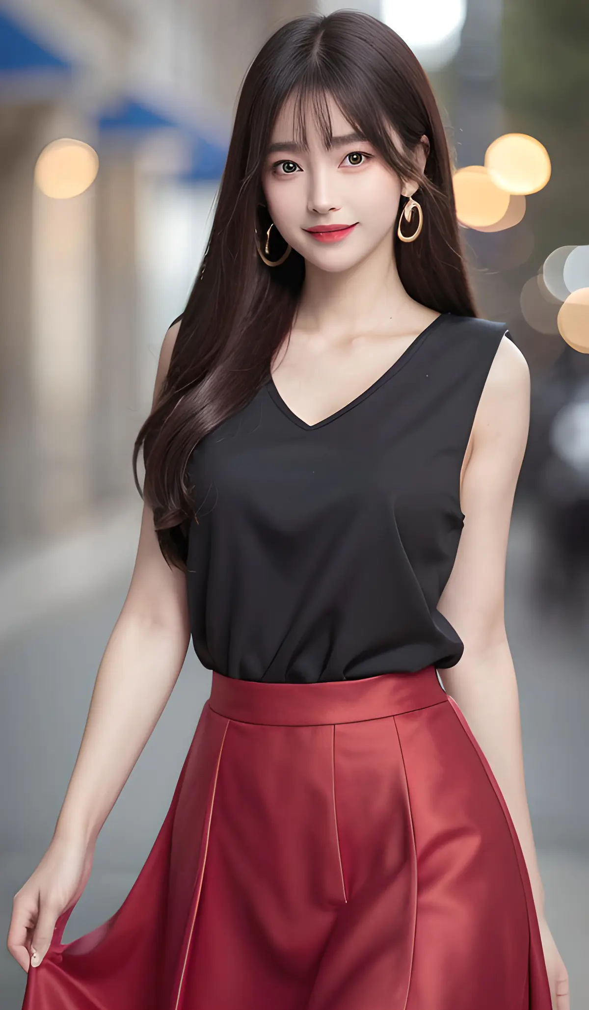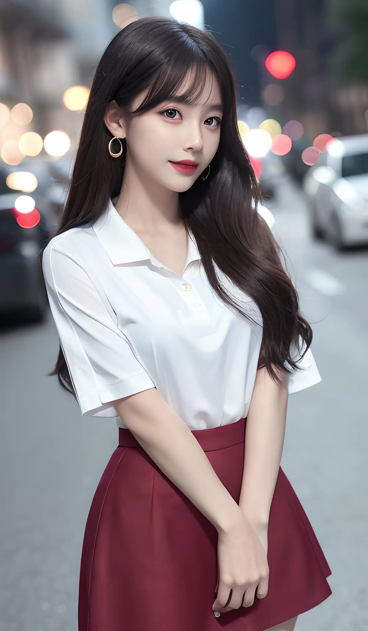 咒语(Prompt): 高细节,8k分辨率,超高分辨率,(黑红短发),杂乱的波浪卷锁骨发,眉间齐刘海,锁骨,真实,逼真,透明水润的肌肤,白皙细腻的皮肤,美丽的妆容,精致完美的五官,最美的大眼睛,长睫毛,眼睛甜美有卧蚕,灿烂的笑,甜美的面容,耳环,迷人的眼神,清纯,淑女,调皮,活泼,可爱,浅笑,微笑,口红,水润的嘴唇,街景实拍,晚上,灯光,夜景,酒红色裙子,连衣裙,长裙,蝴蝶结裙带,裙摆,专业摄影,动态角度,真实,逼真,写实环境,极致画质,最高精度