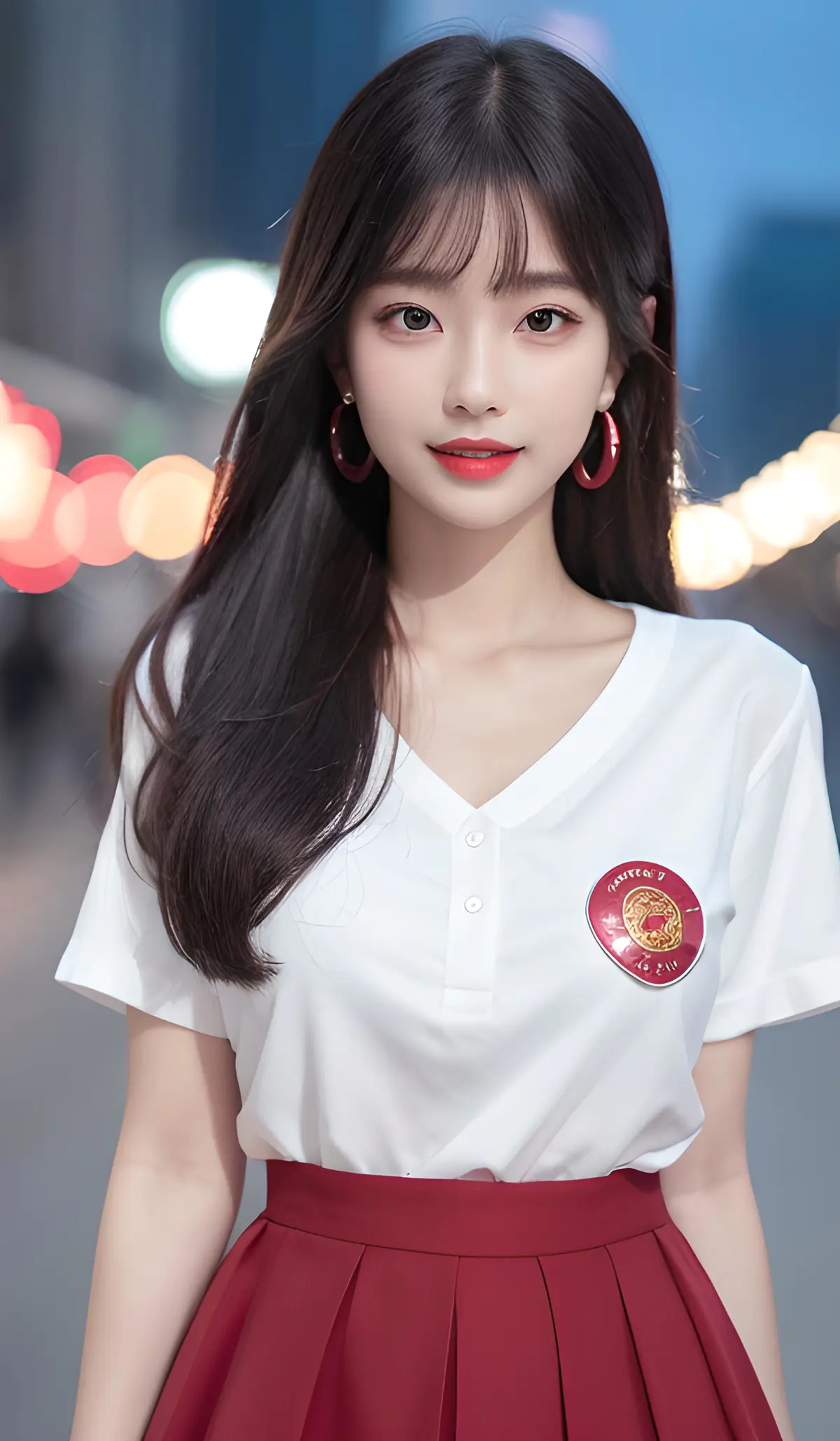 咒语(Prompt): 高细节,8k分辨率,超高分辨率,(黑红短发),杂乱的波浪卷锁骨发,眉间齐刘海,锁骨,真实,逼真,透明水润的肌肤,白皙细腻的皮肤,美丽的妆容,精致完美的五官,最美的大眼睛,长睫毛,眼睛甜美有卧蚕,灿烂的笑,甜美的面容,耳环,迷人的眼神,清纯,淑女,调皮,活泼,可爱,浅笑,微笑,口红,水润的嘴唇,街景实拍,晚上,灯光,夜景,酒红色裙子,连衣裙,长裙,蝴蝶结裙带,裙摆,专业摄影,动态角度,真实,逼真,写实环境,极致画质,最高精度