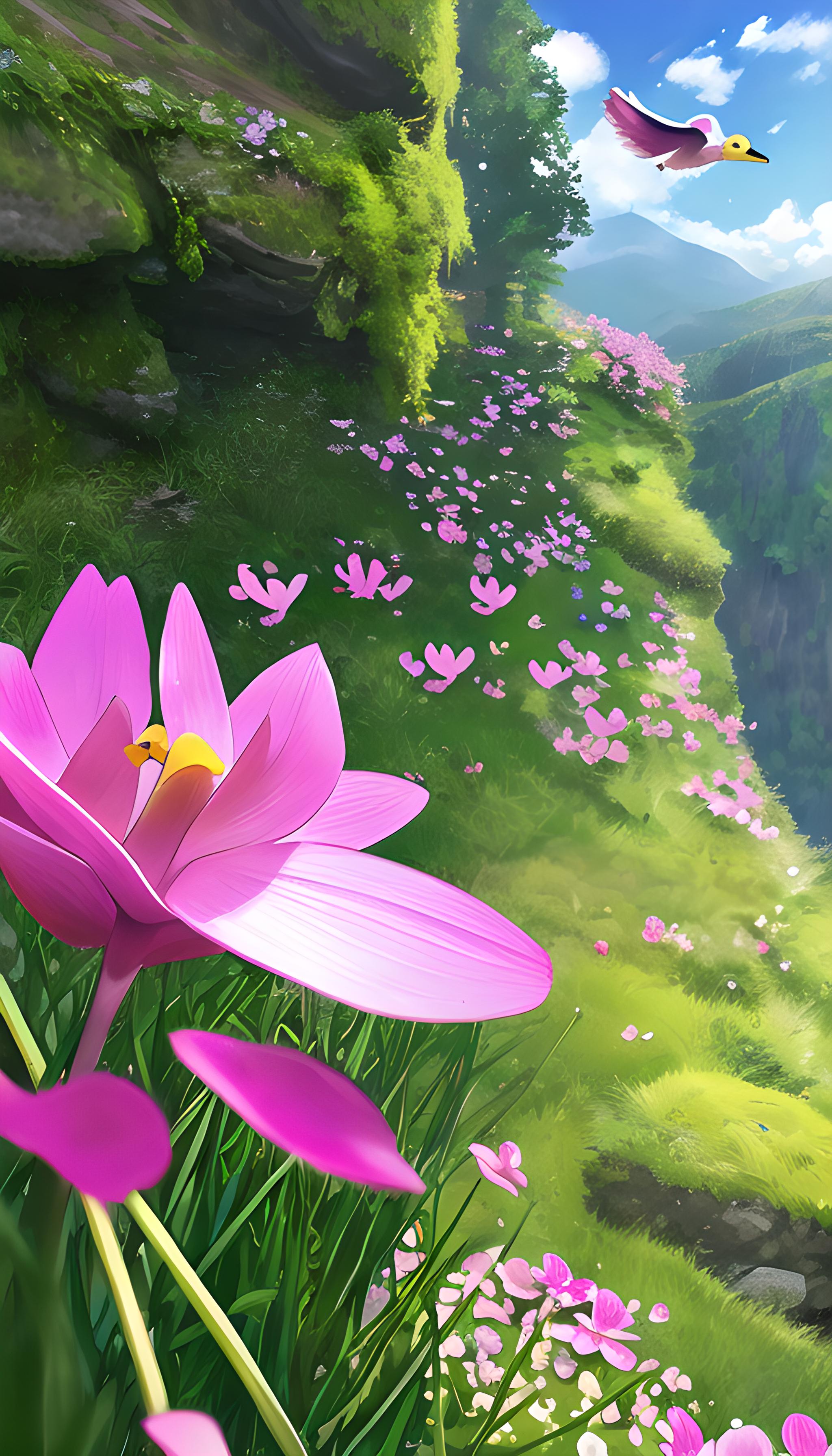 On a sunny day, the pink purple Fly Duck Orchid grows on the steep mountain slope seam, with flowers resembling flying ducks and some moss. The petals are clear and delicate, bright, with a blurry background, lifelike, realistic photos, ultra high definition, 16K high definition, high-definition