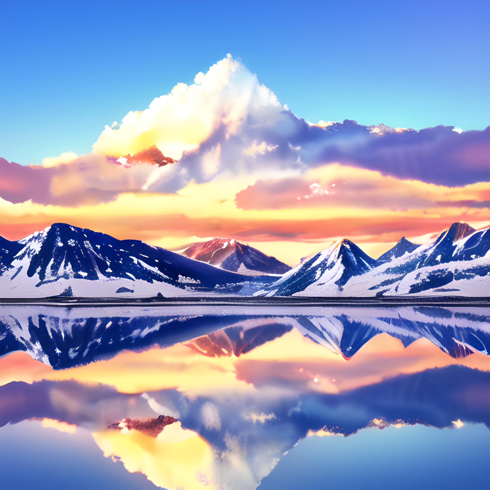 冰山,白巍巍的雪山倒映在平静的湖面,火烧云的天空倒映在湖面上,好大的湖,画面清晰,8k画质!非常漂亮,壮观的景色!