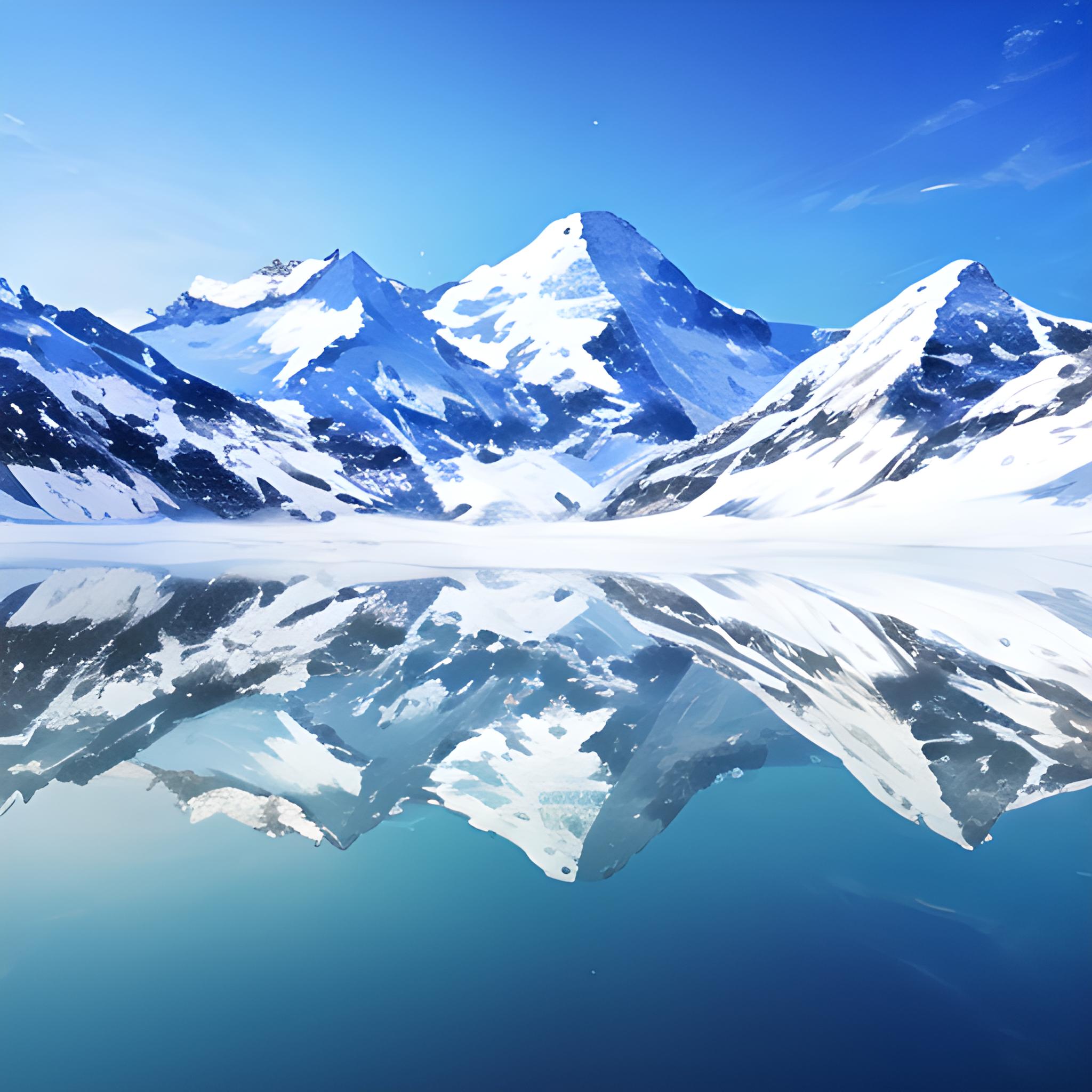 冰山,白巍巍的高大雪山倒映在平静的湖面,五颜六色的天空倒映在湖面上,好大的湖,画面清晰,8k画质!非常漂亮,壮观的景色!