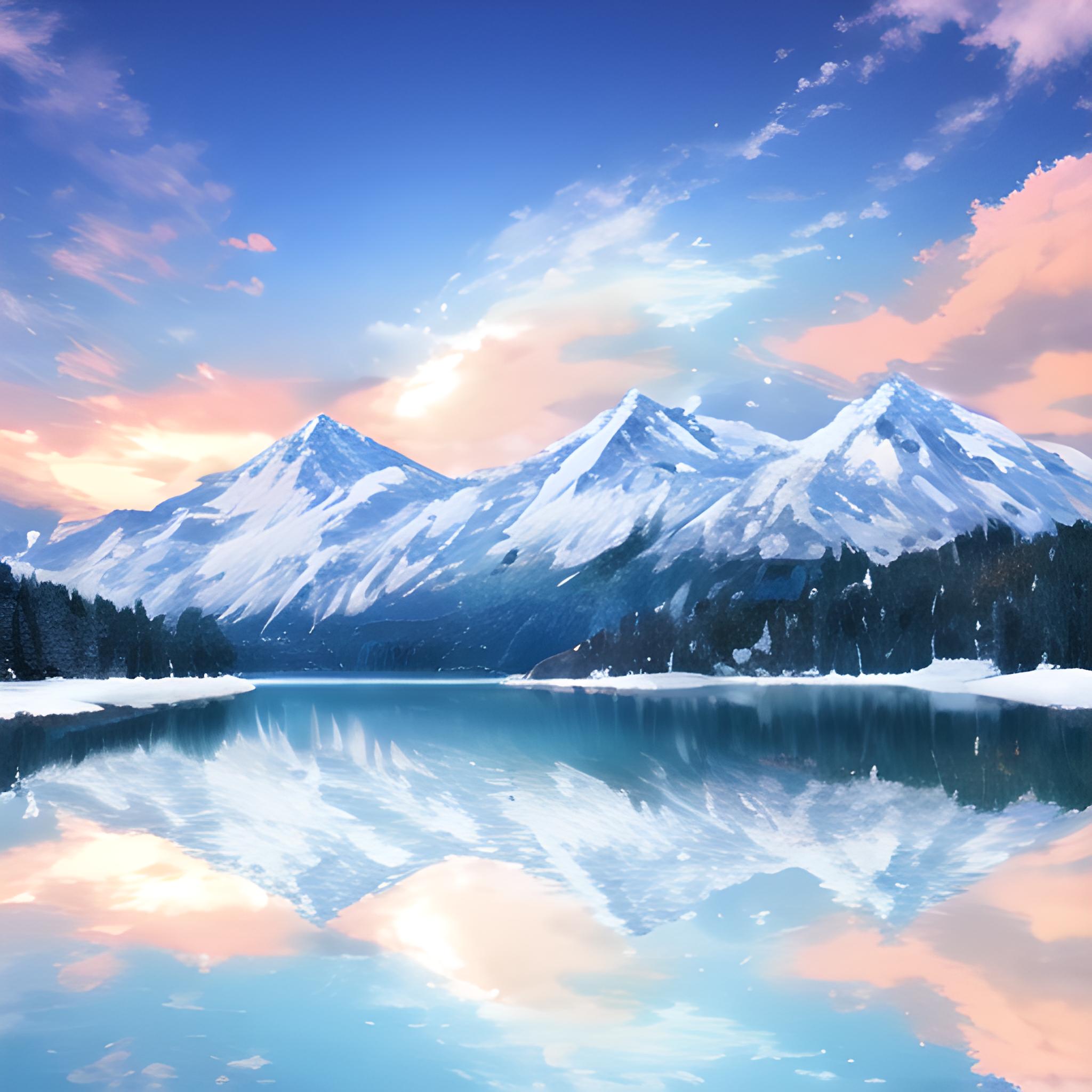 冰山,白巍巍的雪山倒映在平静的湖面,火烧云的天空倒映在湖面上,好大的湖,有一遍绿油油的高大的松村🌲,画面清晰,8k画质!非常漂亮,壮观的景色!