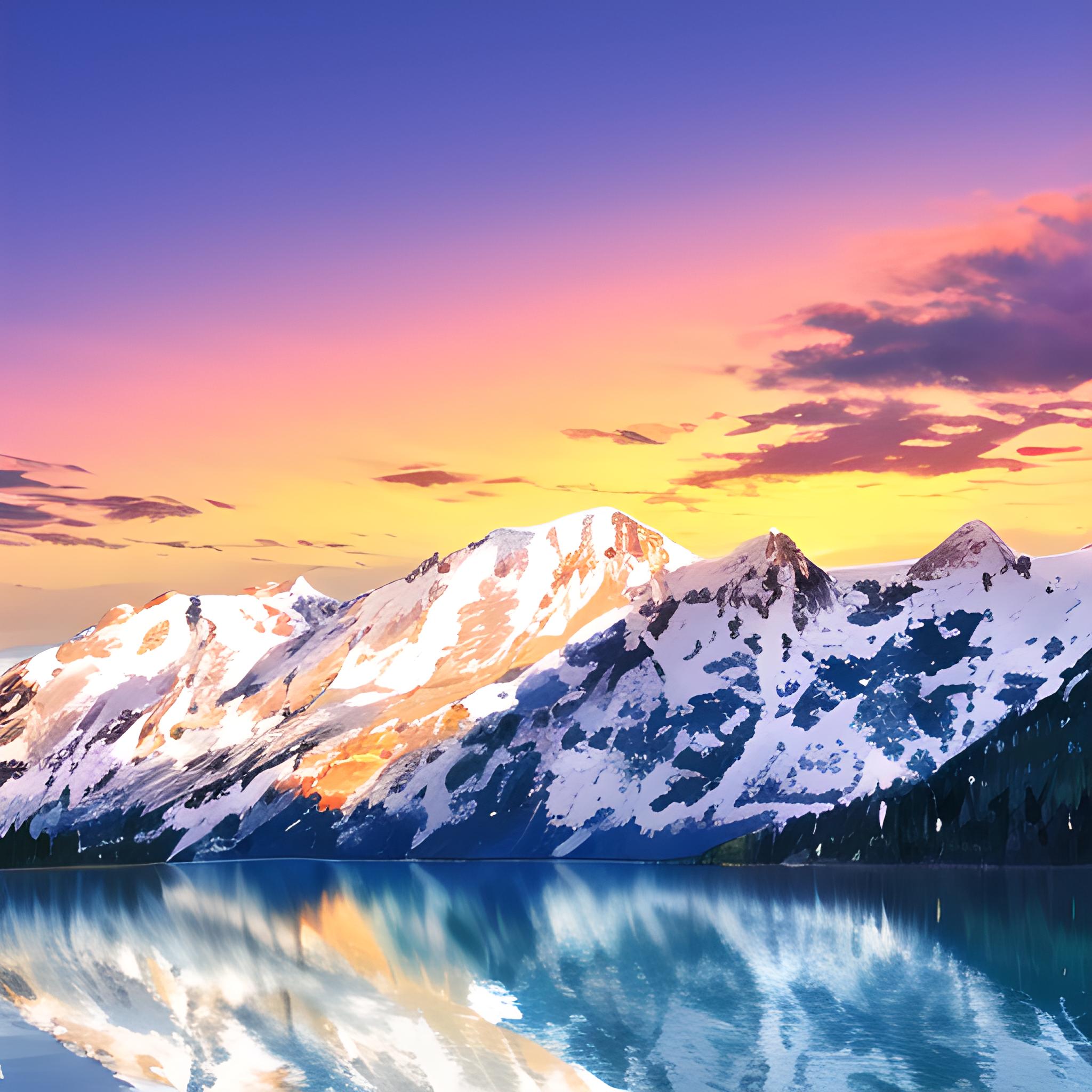 冰山,白巍巍的雪山倒映在平静的湖面,火烧云的天空倒映在湖面上,好大的湖,有一遍绿油油的松🌲,阳光灿烂倒映,画面清晰,8k画质!非常漂亮,壮观的景色! 创作信息