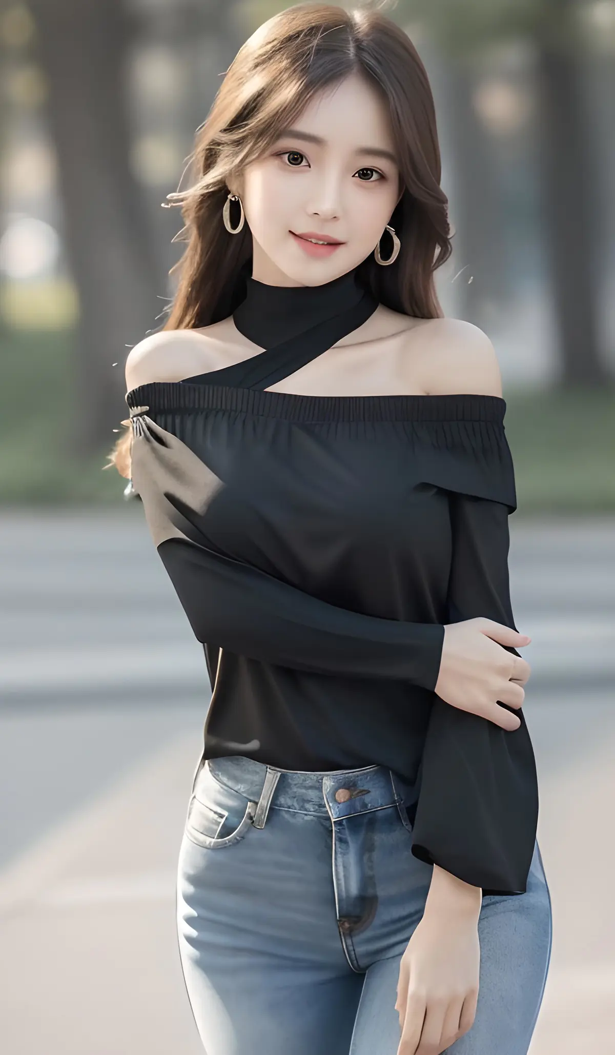 最佳品质,无限细节,最高质量,正面照,漂亮的美少女,柔美,完美比例脸,脸红,大笑,精致的五官,甜美微笑,精致的眼睛,精致的睫毛美丽的眼睛甜美有卧蚕,耳钉,项链,精致的锁骨,长发飘飘,顺滑发丝,((高领露肩衬衫亮晶晶,黑色衬衫紧身牛仔裤:1.3)),包裹感,完美身材,褶皱,细腻的肌肤,不暴露,动态动作,户外,黄昏,田野,景深,大景深,完美细节,极端细节,逼真极致,电影CG渲染,电影光,大师作品,丁达尔效应,北条司的肖像画.超高清,真实,苗条,180,胸部巨大,站姿,街拍